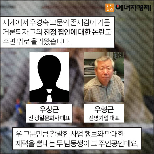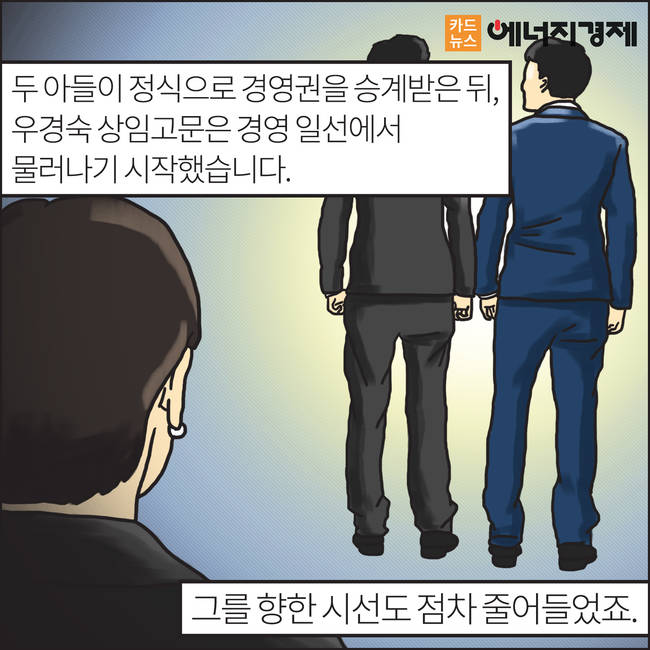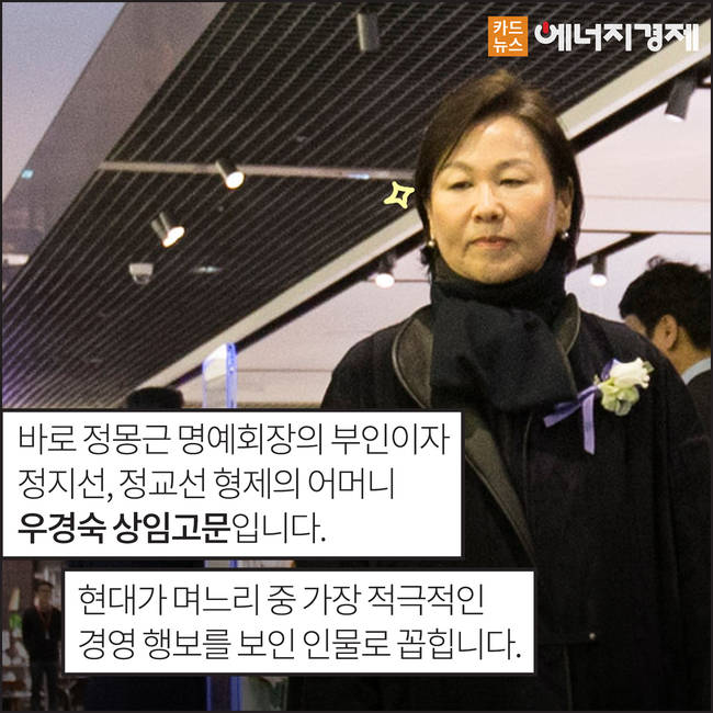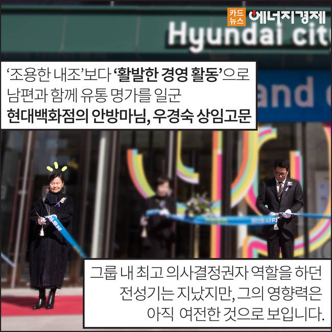 '조용한 내조'보다 '활발한 경영 활동'으로 남편과 함께 유통 명가를 일군 현대백화점의 안방마님, 우경숙 상임 고문. 그룹 내 최고 의사결정권자 역할을 하던 전성기는 지났지만, 그의 영향력은 아직 여전한 것으로 보입니다.