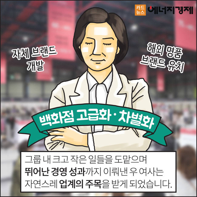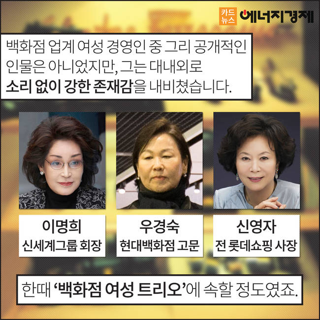 우경숙 여사는 재벌가의 화려한 혼맥과 달리 평범한 가정 출신입니다. 현대그룹 비서실에서 평사원으로 근무할 당시 정몽근 명예회장과 화촉을 밝혔죠. 백화점 업계 여성 경영인 중 그리 공개적인 인물은 아니었지만, 한때 이명희 신세계그룹 회장, 신영자 전 롯데쇼핑 사장과 함께 '백화점 여성 트리오'에 속할 정도로 소리 없이 강한 존재감을 내비쳤습니다.