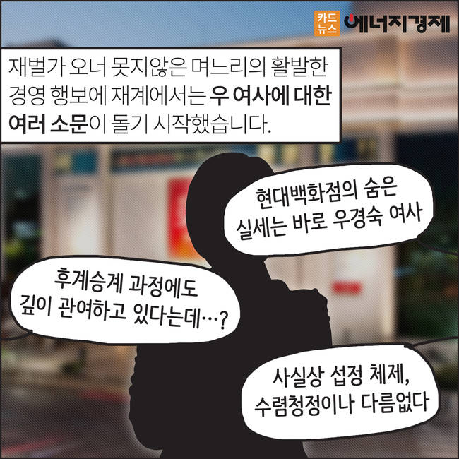 아버지 정몽근 명예회장이 경영 일선에서 물러난 이후 현대백화점을 진두지휘하고 있는 정지선 회장, 정교선 부회장 형제. 하지만 두 형제가 경영권을 물려받을 당시만 해도 재계에서는 현대백화점에 '숨은 실세'가 존재한다는 이야기가 파다했는데요. 바로 정몽근 명예회장의 부인이자 정지선, 정교선 형제의 어머니 우경숙 상임고문입니다.
