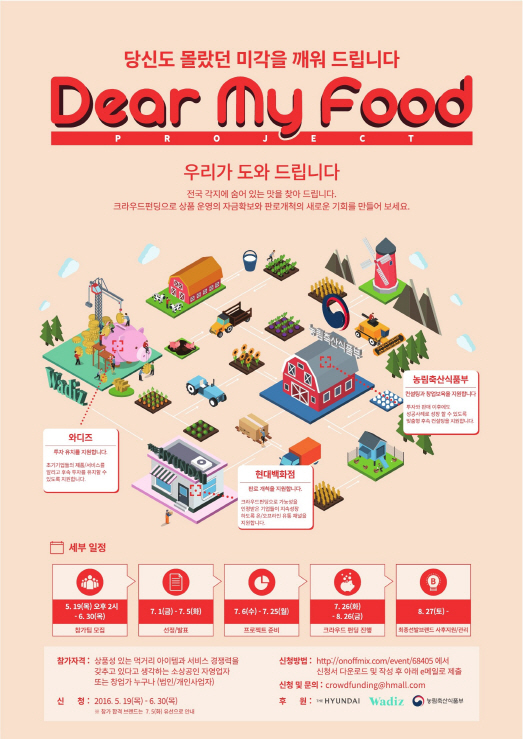 이 프로젝트는 현대백화점, 농림축산식품부, 와디즈가 함께 진행하며 현대백화점은 MD 운영전략, 트렌드, 고객 관리 방안 등 종합적인 브랜드 컨설팅과 팝업스토어 입점 등 판로지원 역할을 맡는다. 농림축산식품부는 아이디어 심사 및 후속 지원을 크라우딩 펀딩 전문기업 와디즈는 창업자금 유치 지원과 브랜드 홍보를 지원할 계획이다. 크라우드 펀딩은 자금이 필요한 개인·기업 등이 웹이나 모바일 네트워크 등을 이용해 불특정다수로부터 자금을 모으는 방식을 말한다.