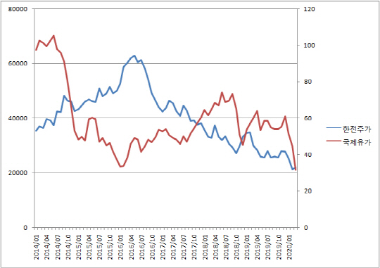 [에너지경제신문 전지성 기자] 한국전력공사의 주가가 저유가에도 속수무책으로 무너지면서 ‘전기요금 인상 카드’도 꺼내기 어려울 것이란 전망이 나온다. 전통적으로 국제 유가 하락은 발전소에 투입되는 석유·석탄 등 연료비 절감으로 이어지면서 한전의 실적을 끌어올려왔다. 그러나 최근 신종 코로나바이러스 감염증(코로나19)으로 인한 경기불확실성 확대에 국제유가가 배럴당 30달러대로 급락했지만 한전의 주가 역시 하락세를 거듭하고 있다. 국제유가와 한전주가 모두 10년만에 최저 수준이다. 이에 올 상반기까지 추진하고 있던 ‘전기요금 현실화’도 차질을 빚을 것이란 우려가 나온다. 기존 탈원전·탈석탄 정책으로 인한 적자에 이은 겹악재다.